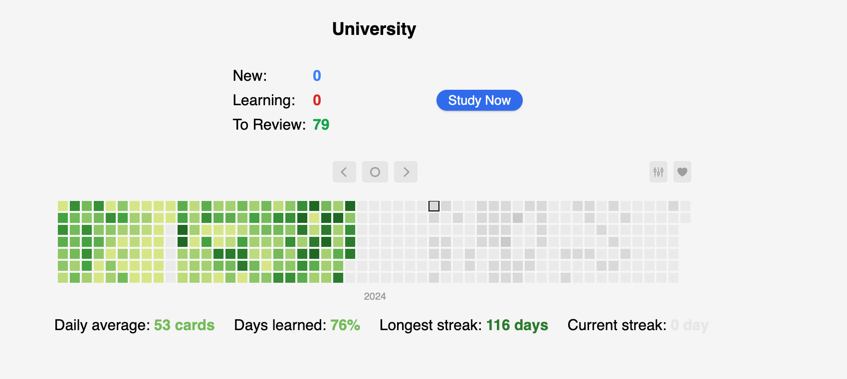 (this is what Anki looks like, each square is a day. The darker it is, the more cards I reviewed on that day).