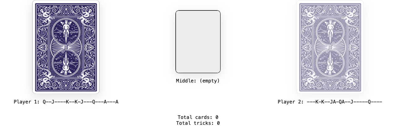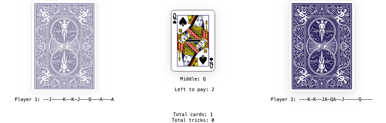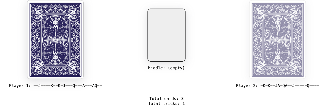 I’m showing the contents of each players’ hands here but in a real game, these would be kept hidden. Since the values of the non-face cards don’t matter, here they’re just denoted with a -, and the suit information is irrelevant to the game so each face card is just ace (A), king (K), queen (Q) or jack (J).