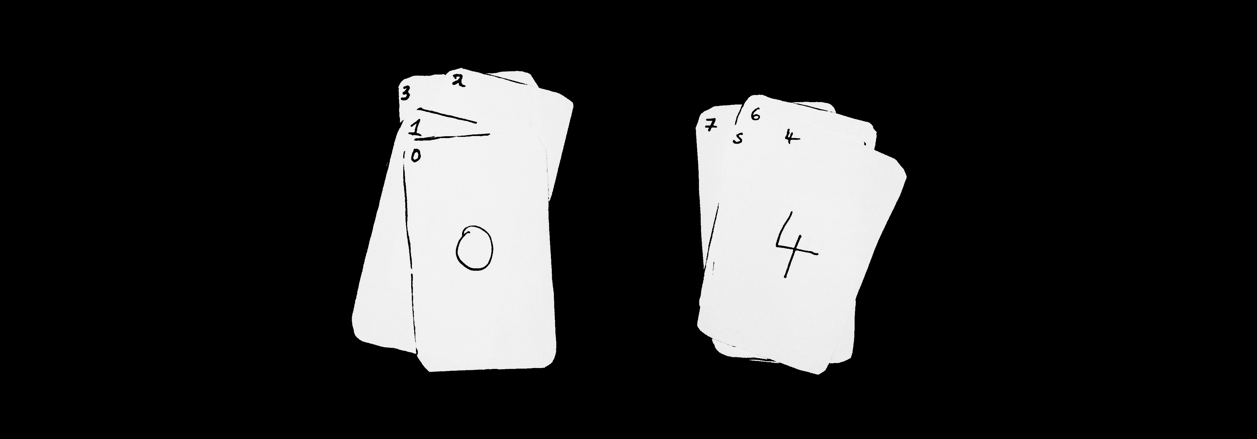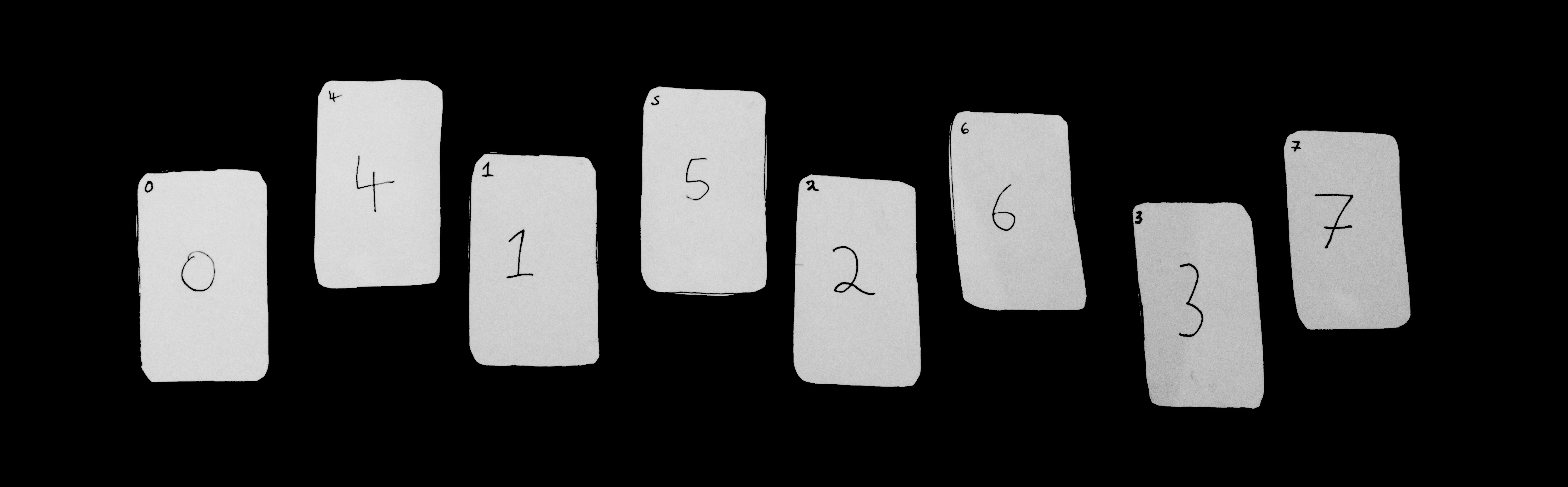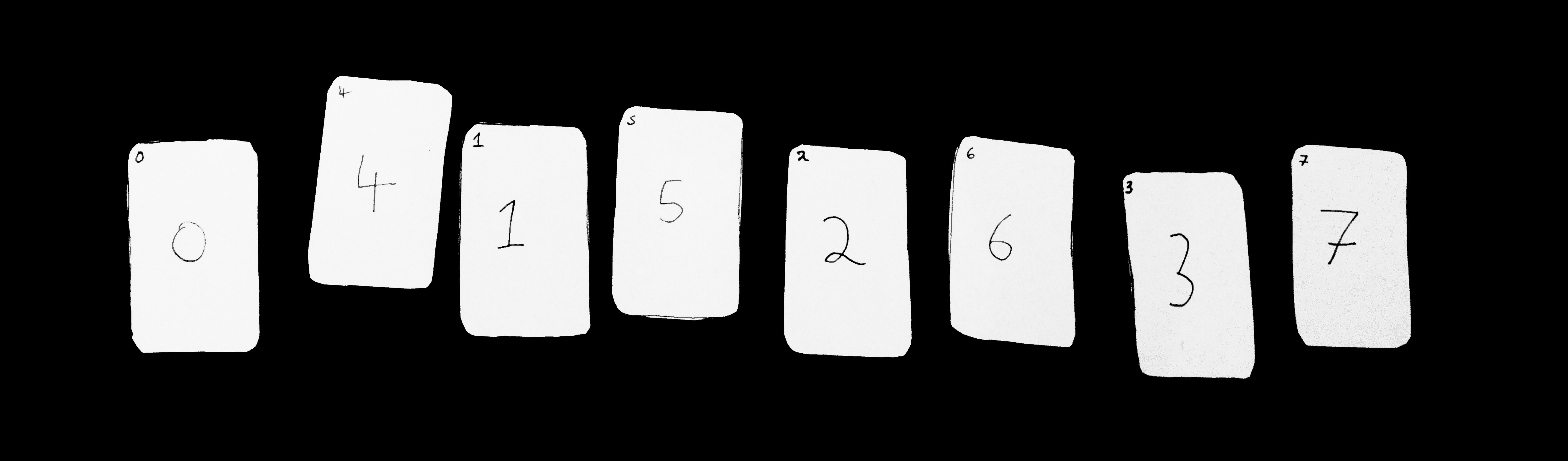 Let’s see if we can formalise what is going on in a perfect riffle shuffle. To simplify, rather than a full deck of 52 cards, it will help to consider just 8 cards. We’ll also forget about suits, and instead label all the cards from 0 to 7: