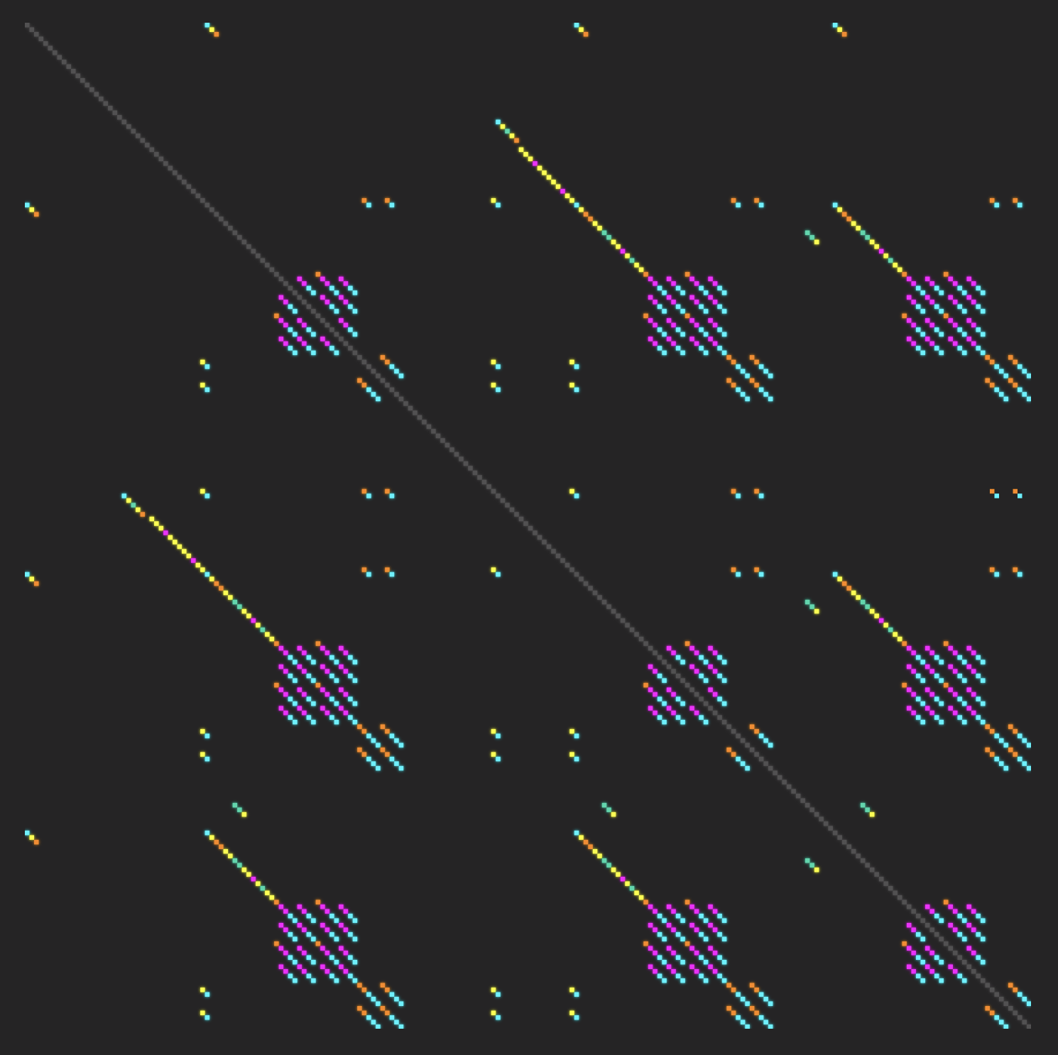 - Clumps of brightness around the diagonal are sections which are very self-similar.
