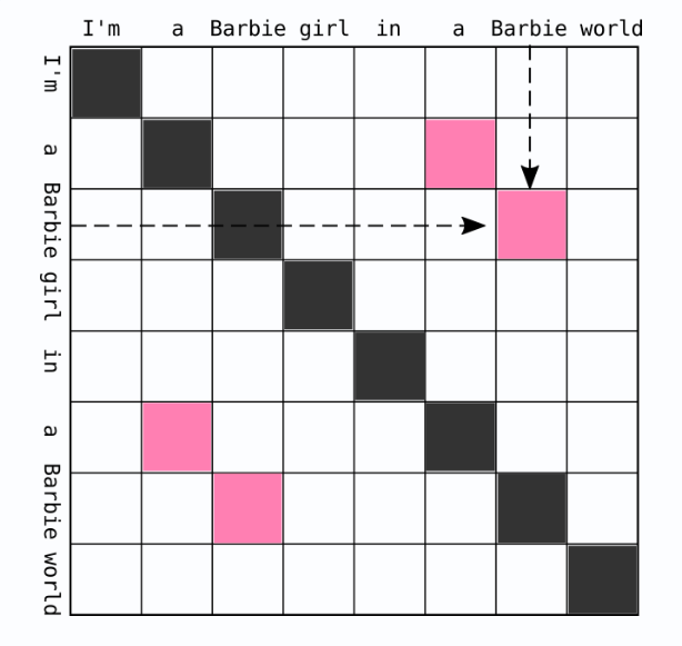 - Splotches of brightness off the diagonal are places where to different parts of the text are similar.