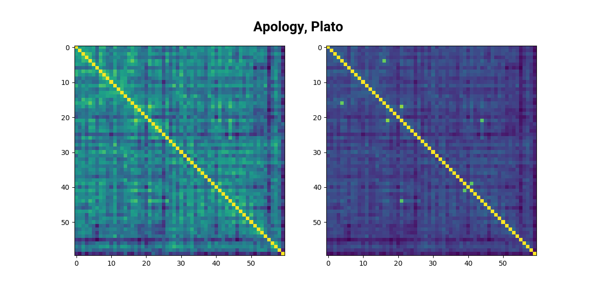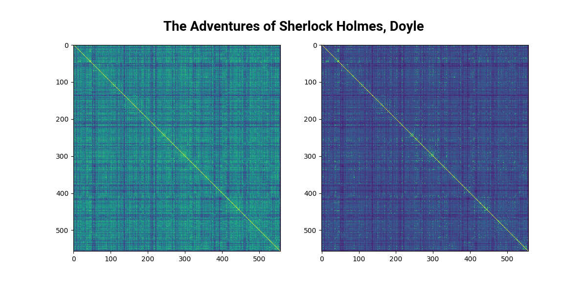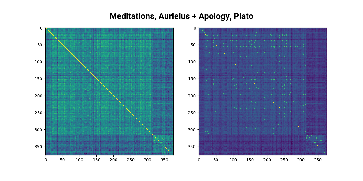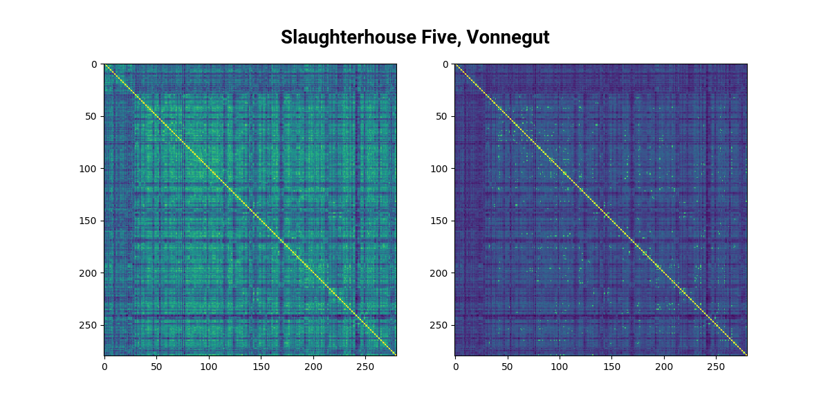 The left hand side of each diagram is the raw semantic similarity between passages, as computed by the all-MiniLM-L6-v2 model. The right hand side highlights the entries which are more than two standard deviations away from the mean, and are anomalously similar compared to the rest of the book.