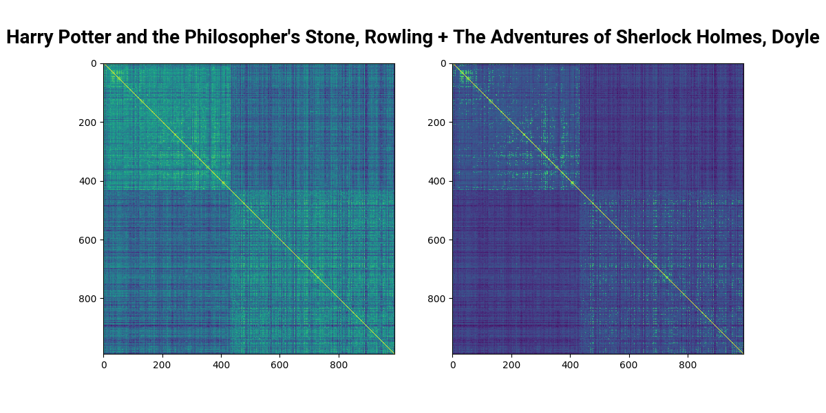 If you concatenate the text for one book after another, you can see sections of cross-text similarity.