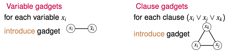 (each variable $x _ i$ has a gadget consisting of $x _ i$ connected to $\overline{x _ i}$, and each clause $x _ i \vee x _ j \vee x _ k$ has a clause gadget which is all three variables connected one another)