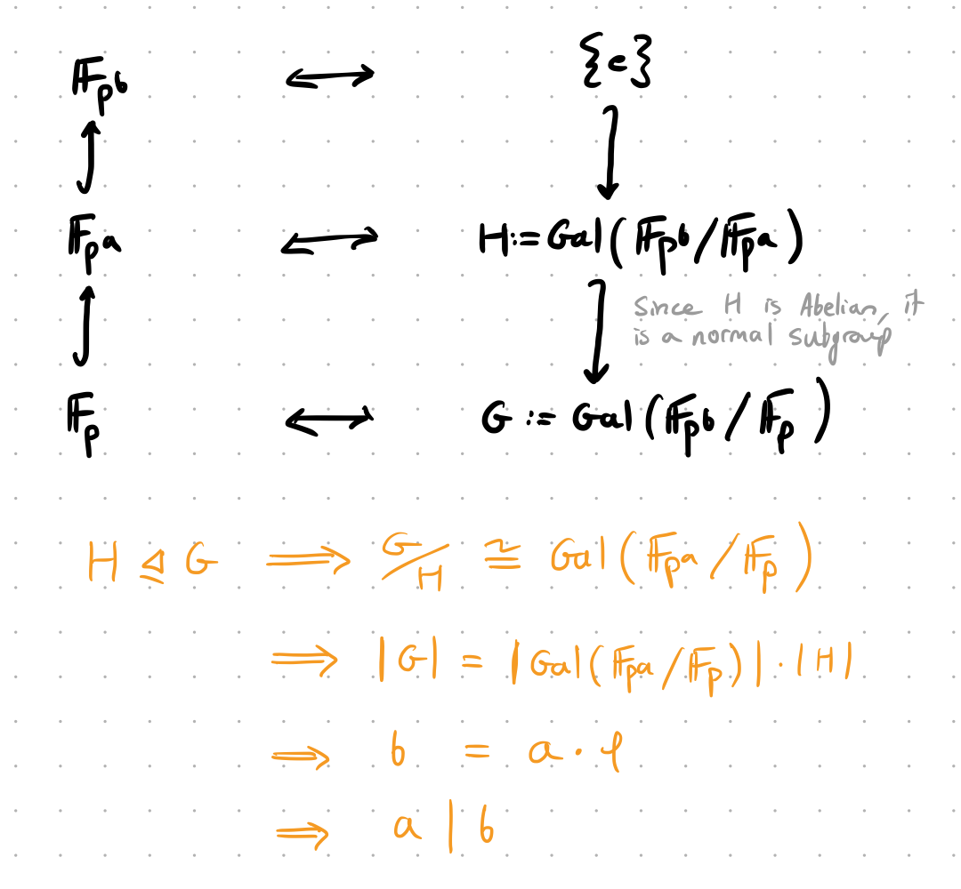 \[\begin{aligned} a \mid b &\implies b = ka \\\\ &\implies p^b - 1 = p^{ka} -1 = (p^k)^a - 1 \\\\ &\implies p^b - 1 = (p^a - 1)(1 + p^a + (p^a)^2 + \cdots + (p^a)^{k-1}) \\\\ &\implies p^a - 1 \mid p^b - 1 \end{aligned}\]Multiplicative structure of finite fields