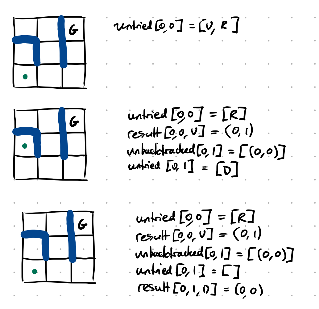 unbacktracked: a table listing, for each state, the untried backtracks (i.e. previous states we can return to)