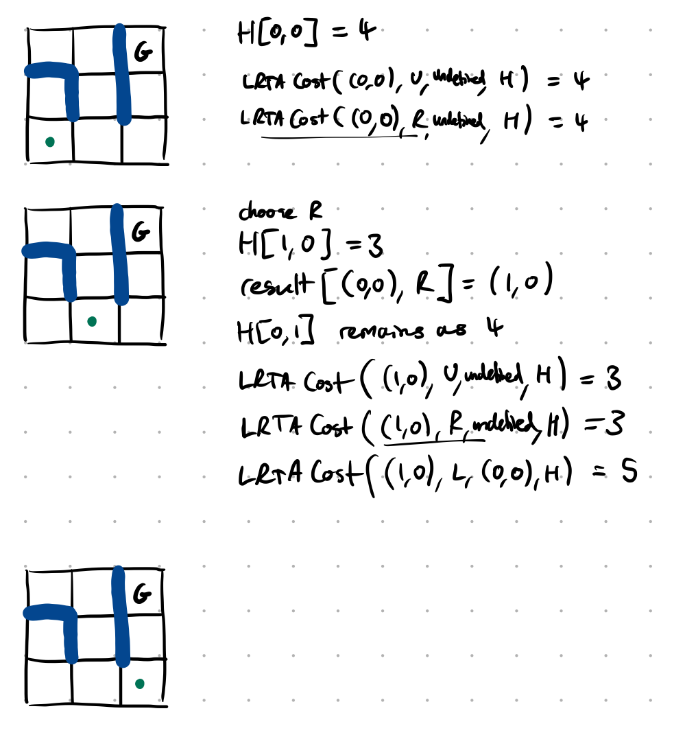 (oops, the line that says “$H[0, 1]$ remains as $4$” should really be $H[0, 0]$ remains as $4$, since the minimum is just over the singleton $\lbrace \mathbf{LRTA}\text{-}\mathbf{Cost}((0, 0), R, (1, 0), H)\rbrace$ which equals $4$)
