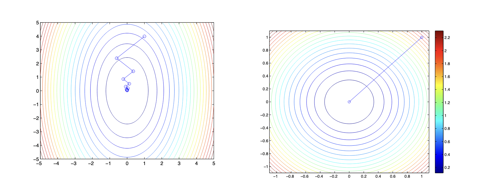 \[x^k = \left( \frac{a-1}{a+1} \right)^k \begin{pmatrix} (-1)^k \\ a \end{pmatrix}, \quad k \ge 0\]Hence $x^k \to 0$ as $k \to \infty$. When $a \gg 1$, then steepest descent converges very slowly.