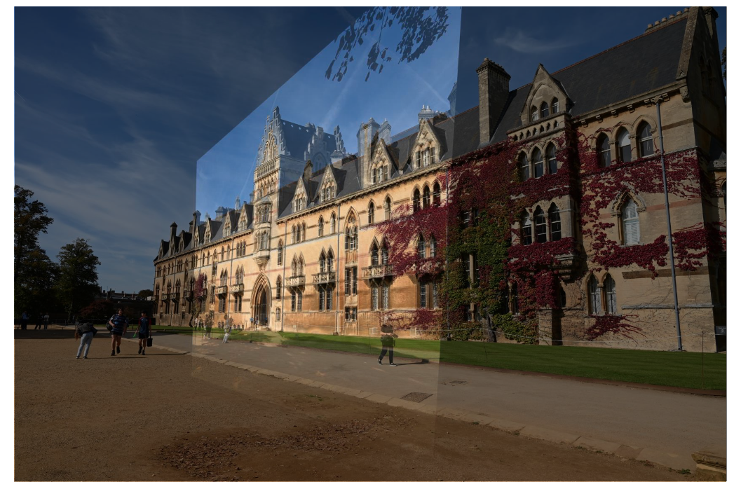 @Visualise how reversing the homography for the image on the right and overlaying it on the image on the right would look.