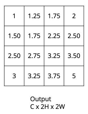 How would the bilinear interpolation upsampling algorithm convert this $C \times H \times W$ image into a $C \times 2H \times 2W$ image?