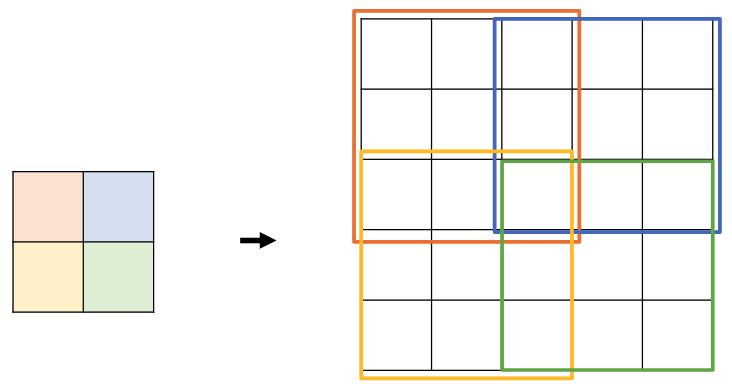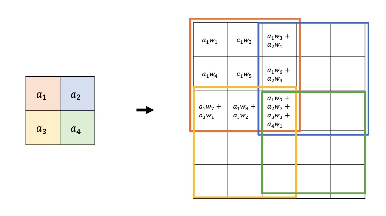 How would a transposed convolution (width, height 3 and stride 2) applied to the input square $a _ 1, a _ 2, a _ 3, a _ 4$ calculate the upsampled version?