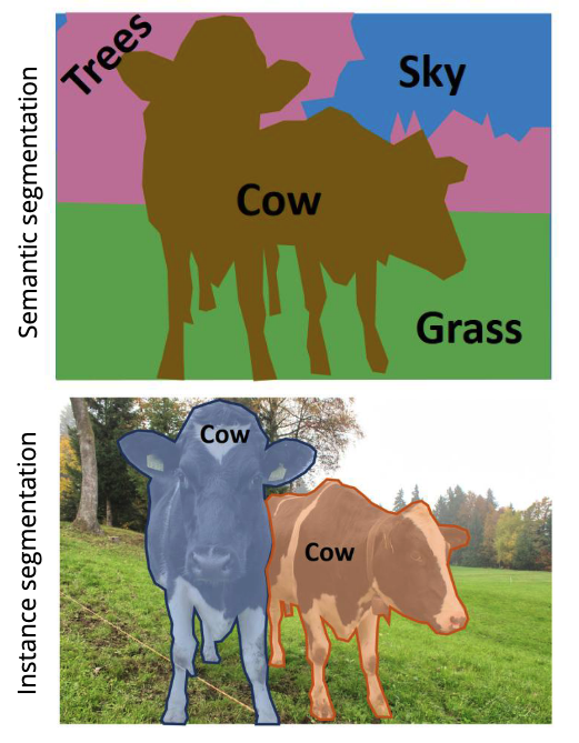 @Visualise the difference between semantic segmentation and instance segmentation.
