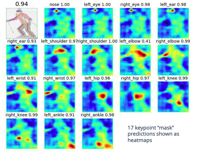 In instance segmentation, we would just predict a mask for the object. Here we predict a heatmap instead, and then convert the heatmap into a keypoint using e.g. a weighted sum over heatmap locations.